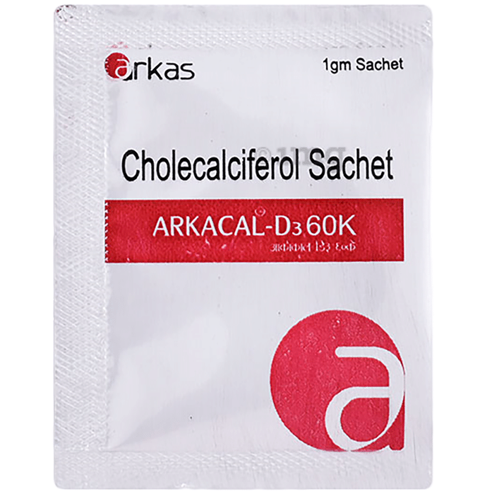 Arkacal D3 60K Granules is a dietary supplement which helps in managing low levels of Vitamin D3 levels in the body. Vitamin D3 is an essential nutrient, responsible for proper absorption of calcium from the foods consumed. It helps in maintaining bone health and structure and reduces risk of bone related ailments.