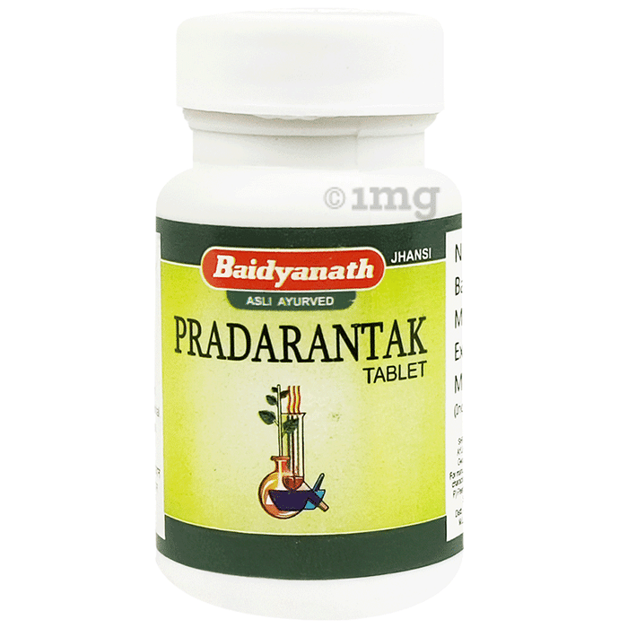 Baidyanath (Jhansi) Pradarantak Tablet is a herbo-mineral ayurvedic medicine referenced from Bhaishajya Ratnavali, Stri-rogadhikara. It is a tablet aushadhi. Parad is an ingredient of numerous medicines due to its powerful medicinal properties. Tablets aushadhi (Parad containing a medicine) are fast-acting. They nourish the whole body and has tonic, aphrodisiac, rejuvenating, anti-ageing, wound-healing and antimicrobial effect. The combination of mercury with other medicinal ingredients enhances the therapeutic efficacy of medicine due to yogvahi property of parad.
