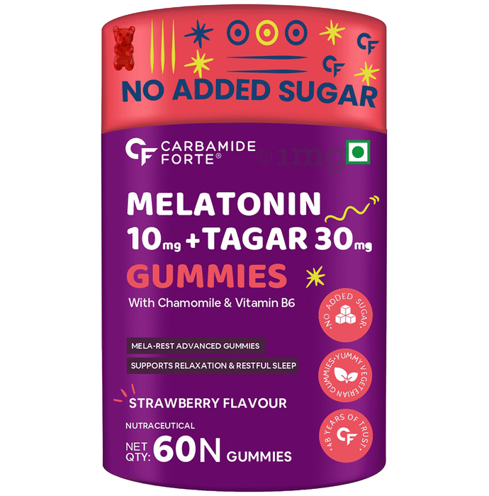 Carbamide Forte Melatonin 10mg + Tagara 30mg Vegetarian Yummy Gummies Orange Melatonin is a hormone made in the body. It regulates night and day or sleep-wake cycles. Some people who have trouble sleeping have low levels of melatonin. These melatonin gummies might help with sleep. People commonly use these gummies to support sleep during jet lag.