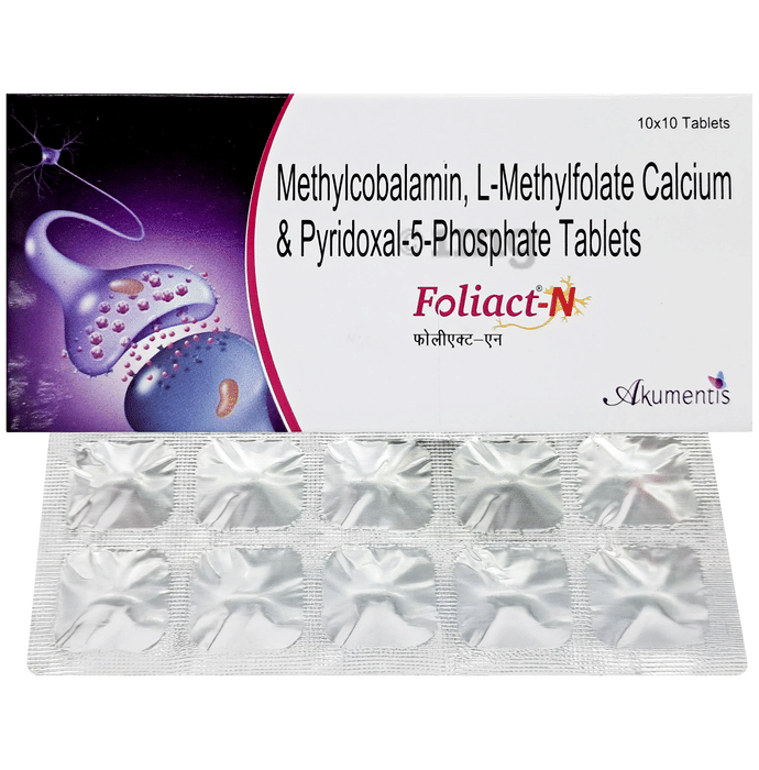 Foliact-N Tablet is a nutritional supplement that contains a combination of L-methyl folate, pyridoxine and methylcobalamin. It is used to prevent and manage certain types of anaemia caused by the deficiency of these vitamins. Additionally, Foliact-N Tablet may also be used to support the healthy functioning of nerves and the brain