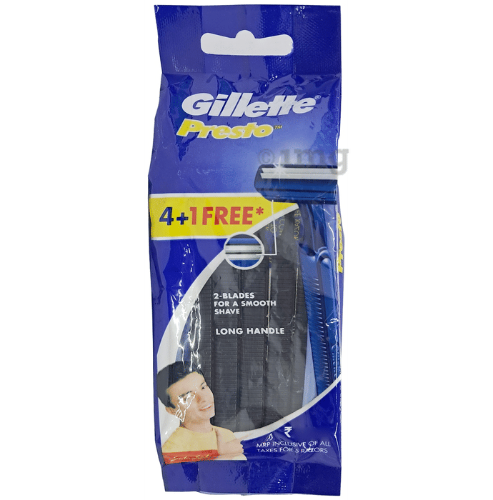 Gillette Presto Razor features two blades that help remove facial hair while gliding across the face with less tug and pull. It has a long handle design