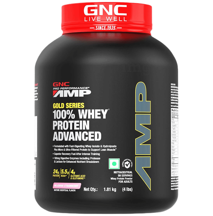 GNC Amp Gold 100% Whey Protein Advanced Powder is formulated with fast-digesting whey isolate and whey hydrolysate. Hydrolysed whey peptides can help in absorption and nutrient uptake. It provides 5.5 gm of branched-chain amino acids to help with recovery and performance. It also provides 4 gm of glutamine and glutamine precursors to aid in maximising muscle recovery, which is important for hydrating and fueling muscle cells and maintaining proper absorptive function in the digestive system. The 100 gm digestive enzymes with amino gen and lactase work to improve nutrient breakdown.