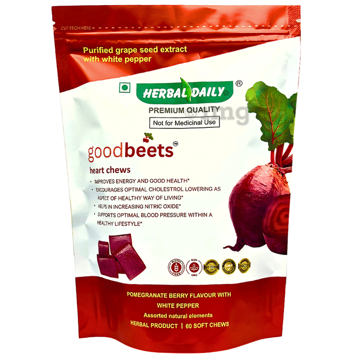 "Goodbeets" is a healthful chewing gum that helps maintain better heart health and may regulate high cholesterol. It is prepared using a combination of grape seed extract, beetroot powder, white pepper powder, tapioca powder, cane sugar, rice bran and more to offer numerous health benefits. It helps in alleviating heart ailments and could help regulate high blood pressure. It may also help in enhancing circulation and Increase nitric oxide levels in blood. Moreover, it may also be helpful in improving brain health, detoxifying the body, empowering muscles, promoting bone health, and enhancing digestion and joint health.