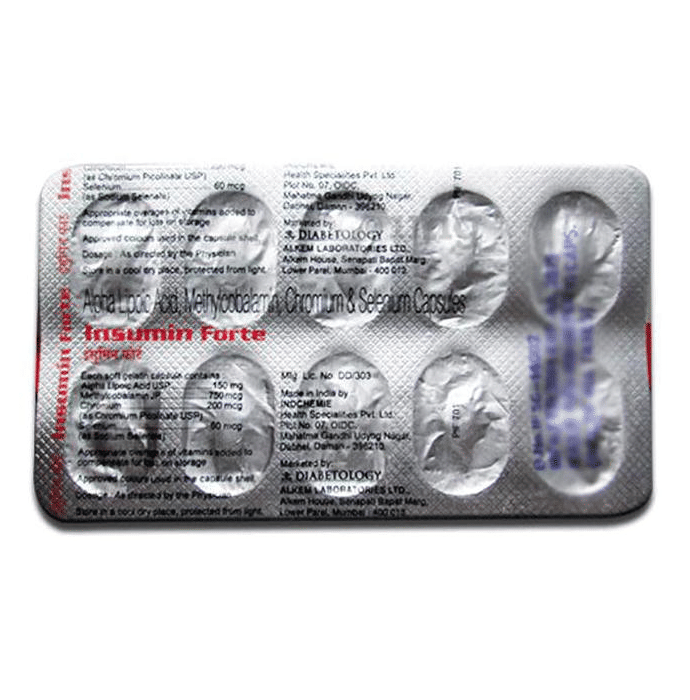 Insumin Forte Capsule is used for symptoms associated with high blood sugar including burning, pain, and numbness in the legs and arms.