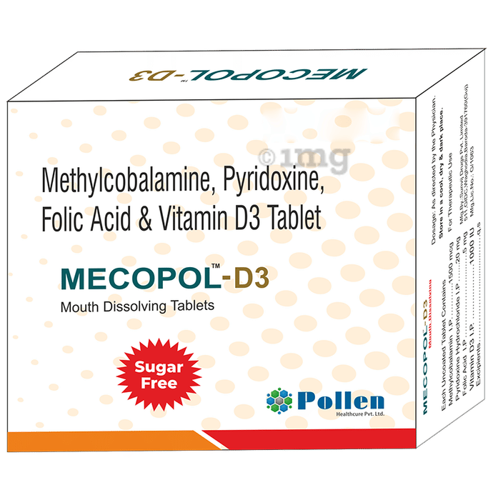 Mecopol Mecopol- D3 Mouth Dissolving Tablet Sugar Free is formulated with a combination of essential vitamins, including Methylcobalamin, Pyridoxine Hydrochloride, Folic Acid, and Vitamin D3, which may contribute to overall well-being. These nutrients can support various physiological functions, including nerve health, red blood cell formation, bone health, and immune function. Methylcobalamin, a bioavailable form of Vitamin B12, may help maintain nerve function and cognitive performance, while Pyridoxine Hydrochloride (Vitamin B6) can aid in protein metabolism and neurotransmitter synthesis. Folic Acid may contribute to DNA synthesis and cellular growth, making it essential for overall metabolic health. Vitamin D3 can play a crucial role in calcium absorption and bone mineralisation, supporting musculoskeletal health. The mouth-dissolving formulation ensures faster absorption and easy consumption, making it convenient for individuals who have difficulty swallowing tablets.