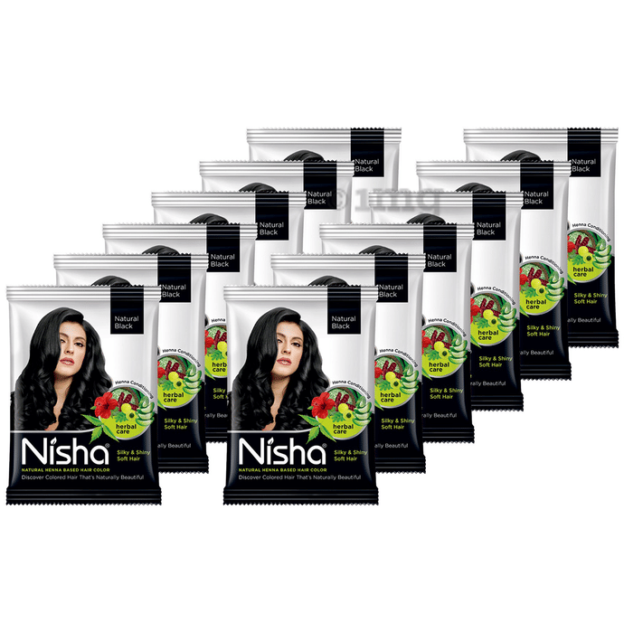 Nisha Natural Henna Based Hair Color Natural Black Pack of 12 is a powder hair colour enriched with Indian herbs like Henna, Amla, Aloe Vera, Hibiscus and Shikakai. This hair colouring powder is designed to impart natural-looking black tones. The presence of herbal powders helps condition the hair and support scalp care, offering softness and a smoother appearance. Henna, rich in natural pigments, helps impart a rich colour while the blend of herbs may support hair texture and moisture retention. This colourant offers semi-permanent coverage in line with its application duration.