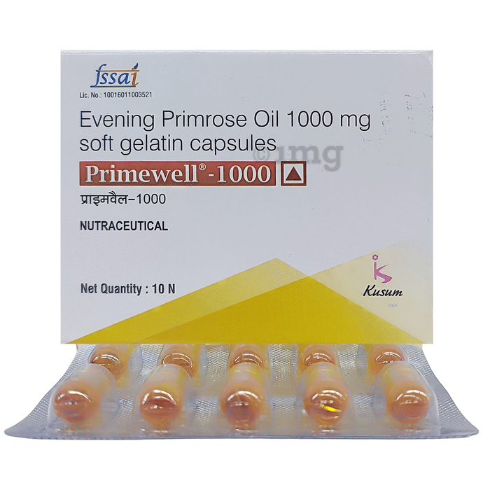 Primewell 1000mg Soft Gelatin Capsule contains Evening Primrose Oil (1000 mg) as the active ingredient and other ingredients including Food grade gelatin used in capsule shells (428), Glycerine (422), Sorbitol(420i), Soya Oil, Bees Wax (901), Antioxidant (320, 321) & Preservative (218, 216)