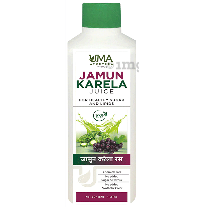Uma Ayurveda Jamun Karela is an Ayurvedic formulation crafted with the synergistic blend of Jamun (Syzygium cumini) and Karela (Momordica charantia), that have supportive action on healthy blood sugar and digestive wellness. This juice can help to maintain metabolic balance, support the liver, and care for skin health through natural means. With its naturally bitter yet potent constituents, the formulation may assist the body in regulating glucose levels and purifying blood, while also helping support fat metabolism and digestion. It is chemical-free and contains no added sugar, flavour, or synthetic colour, making it a clean and safe herbal choice for daily use.