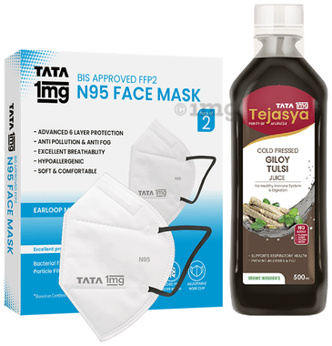 Combo Pack of Tata 1mg Tejasya Giloy Tulsi Juice (500ml) & Tata 1mg BIS Approved FFP2 N95 Mask White - Ear Loop, Premium Face Mask 6 Layers (2)
