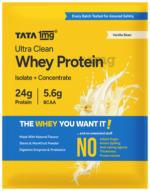 Ultra Clean Whey Protein Isolate + Concentrate | 24g Protein, 5.6g BCAAs per Serve | by Tata 1mg | Vanilla Bean No Added Sugar