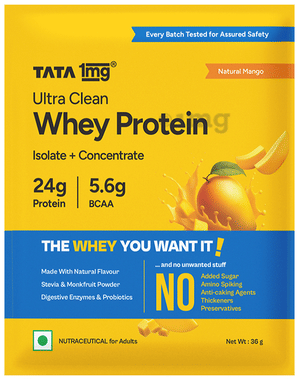 Ultra Clean Whey Protein Isolate + Concentrate | 24g Protein, 5.6g BCAAs per Serve | by Tata 1mg | Natural Mango No Added Sugar