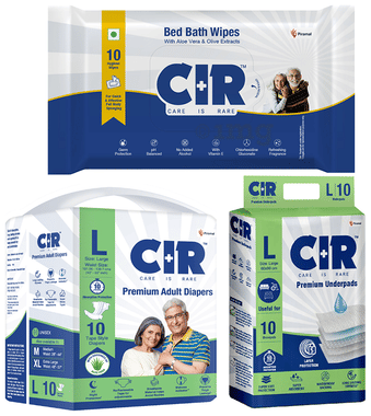 Combo Pack of CIR Premium Adult Unisex Diaper with Aloe Vera Large (10) & Bed bath Wipe (10) & Premium Underpad Large (10)