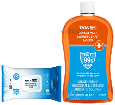 Combo Pack of Tata 1mg Antiseptic Liquid (500ml) & Tata 1mg Multipurpose Germ Protection Wipes (72)