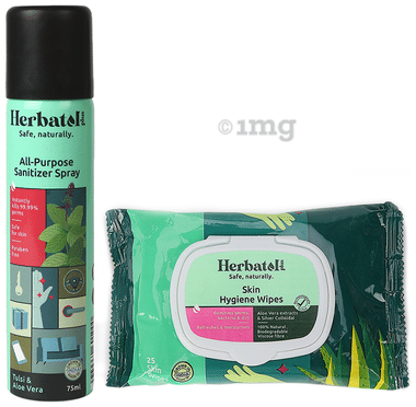 Herbatol Plus Combo Pack of All-Purpose Sanitizer Spray 75ml & Skin Hygiene 25 Wipes