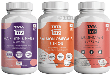 Combo Pack of Tata 1mg Multivitamin Supreme Capsule (60), Salmon Omega 3 Fish Oil Capsule (60) & Hair, Skin & Nails Supreme Capsule (60)