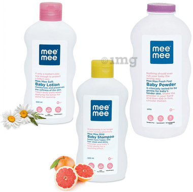 Mee Mee Combo Pack of Soft Baby Lotion 500ml, Mild Baby Shampoo 500ml & Fresh Feel Baby Powder 500gm