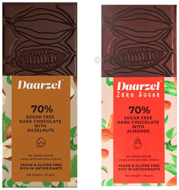 Daarzel Zero Sugar Combo Pack of 70% Sugar Free Dark Chocolate with Orange, 70% Sugar Free Dark Chocolate with Hazelnuts, 70% Sugar Free Dark Chocolate with Mint, 70% Sugar Free Dark Chocolate with Almonds & 70% Sugar Free Dark Chocolate (50gm Each)