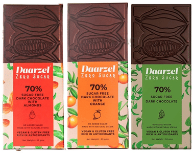 Daarzel Zero Sugar Combo Pack of 70% Sugar Free Dark Chocolate with Almonds, 70% Sugar Free Dark Chocolate with Orange & 70% Sugar Free Dark Chocolate (50gm Each)