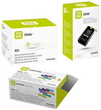 My life Combo Pack of Unio Blood Glucose Monitoring System with 10 Strips, Blood Glucose 50 Test Strips & 30G Multicolor 200 Lancets