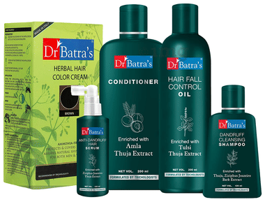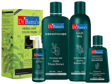 Dr Batra's Combo Pack of Dandruff Cleansing Shampoo 100ml, Conditioner 200ml, Anti-Dandruff Hair Serum 125ml, Hair Fall Control Oil 200ml and Herbal Hair Color Cream 130gm Brown
