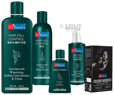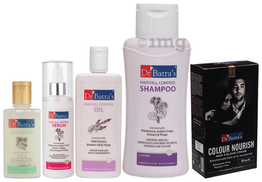 Dr Batra's Combo Pack of Hair Fall Control Serum 125ml, Conditioner 100ml, Hair Fall Control Oil 200ml, Hair Fall Control Shampoo 500ml and Colour Nourish Hair Colour Cream 120gm Black