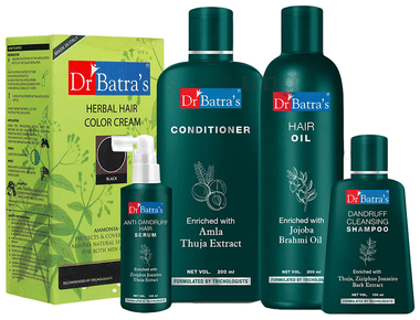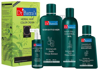 Dr Batra's Combo Pack of Dandruff Cleansing Shampoo 100ml, Conditioner 200ml, Anti-Dandruff Hair Serum 125ml, Hair Fall Control Oil 200ml and Herbal Hair Color Cream 130gm Black