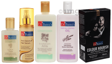 Dr Batra's Combo Pack of Anti-Dandruff Hair Serum 125ml, Dandruff Cleansing Shampoo 100ml, Hair Fall Control Oil 200ml, Conditioner 200ml and Colour Nourish Hair Colour Cream 120gm Black