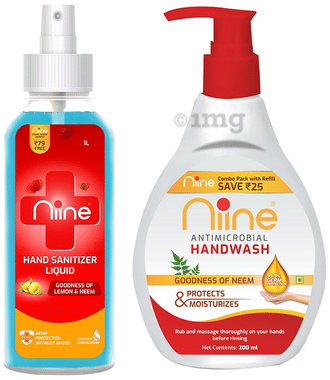 Niine Combo Pack of Hand Sanitizer Liquid Spray 1 Ltr & Antimicrobial Handwash 200ml