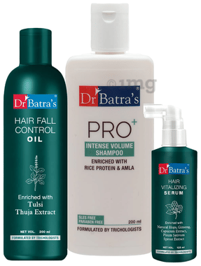 Dr Batra's Combo Pack of Hair Vitalizing Serum 125ml, Hair Fall Control Oil 200ml and Pro+ Intense Volume Shampoo 200ml