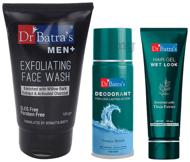 Dr Batra's Combo Pack of Men+ Exfoliating Face Wash 125gm, Deodorant for Men 100gm and Hair Gel Wet Look 100gm