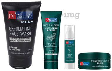 Dr Batra's Combo Pack of Men+ Exfoliating Face Wash 125gm, Natural Skin Lightening Cream 100gm, Skin Fairness Serum 50gm and Intense Moisturizing Cream 100gm
