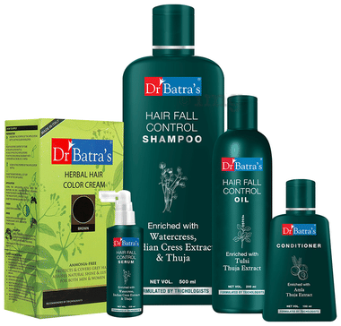Dr Batra's Combo Pack of Hair Fall Control Serum 125ml, Conditioner 100ml, Hair Fall Control Oil 200ml, Hair Fall Control Shampoo 500ml and Herbal Hair Color Cream 130gm Brown