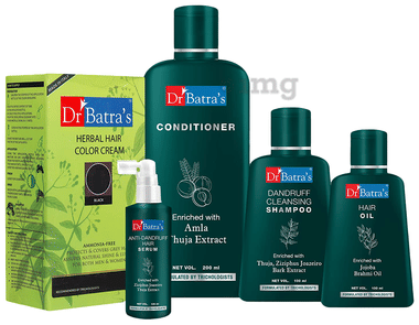 Dr Batra's Combo Pack of Anti-Dandruff Hair Serum 125ml, Dandruff Cleansing Shampoo 100ml, Hair Oil 100ml, Conditioner 200ml and Colour Nourish Hair Colour Cream 120gm Black