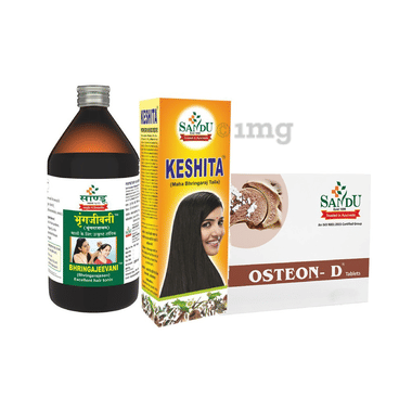 Combo Pack of Sandu Bhringajeevani 450ml, Sandu Keshita Maha Bhringaraj Taila 100ml & Sandu Osteon-D Tablet (60)