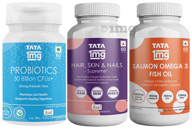 Combo Pack of Tata 1mg Salmon Omega 3 Fish Oil Capsule (60), Hair, Skin & Nails Supreme Biotin Capsule (60) & Probiotics 30 Billion CFUs+ Capsule (60)