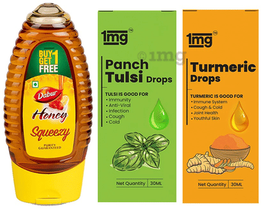 Warm Milk Mix Recipe of 1mg Turmeric Drops with Piperine 30ml, 1mg Panch Tulsi Drops 30ml and Dabur Honey Squeezy Buy 1 Get 1 Free 225gm
