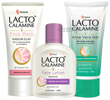Combo Pack of Piramal Lacto Calamine Face Wash 100ml, Lacto Calamine Aloe Vera Gel 150gm & Lacto Calamine Face Lotion Combination to Normal Skin 60ml