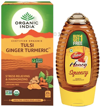 Anti-oxidants Combo of Organic India Tulsi Ginger Turmeric 25 Tea Bag and Dabur Honey Squeezy 225gm (Buy 1 Get 1 Free)