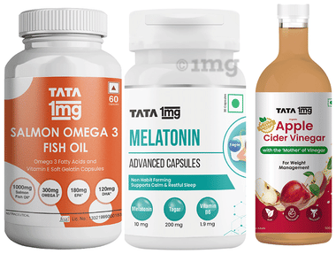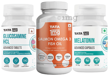 Combo Pack of Tata 1mg Glucosamine HCL Advanced Tablet (60), Melatonin Advanced Capsule (30) and Salmon Omega 3 Fish Oil Capsule (60)