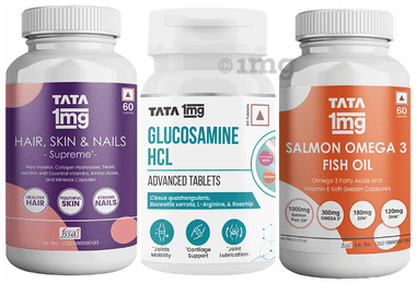 Combo Pack of Tata 1mg Glucosamine HCL1500 mg Advanced Tablet (60) ,Salmon Omega 3 Fish Oil A dvanced Capsule (30) & Hair, Skin & Nails Supreme Capsule(60)