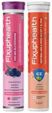 Combo Pack of Fixuphealth Natural Amla 1000mg Vit C & Zinc Effervescent Tablet Orange (20) & Fixuphealth Glutathione 500mg Effervescent Tablet Strawberry (15)