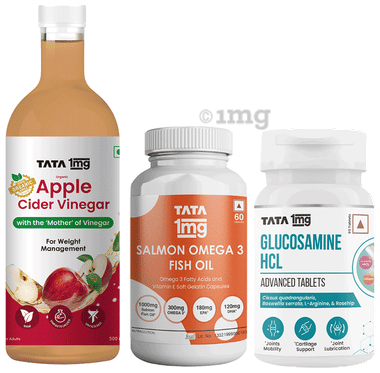 Combo Pack of Tata 1mg Glucosamine HCL 1500 mg Advanced Tablet (60),Salmon Omega 3 Advanced Capsule (60) & Organic Apple Cider Vinegar (500ml)