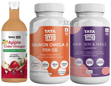 Combo Pack of Tata 1mg Calcium + Vitamin D3 Advanced Tablet (60), Salmon Omega 3 Fish Oil Capsule (60) and Hair, Skin & Nails Supreme Capsule (60)