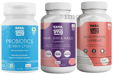 Combo Pack of Tata 1mg Multivitamin Supreme Capsule (60), Hair, Skin & Nails Supreme Capsule (60) & Probiotics 30 Billion CFUs+ Capsule (60)