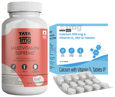 Combo Pack of Tata 1mg Multivitamin Supreme, Zinc, Calcium and Vitamin D Capsule (60) & Tata 1mg Calcium 500mg & Vitamin D3 250IU Tablet (15)