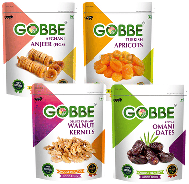 Combo Pack of Gobbe Afghani Anjeer,Turkish Apricots, Deluxe Kashmiri Walnut Kernels, Royal Omani Dates (200gm Each)