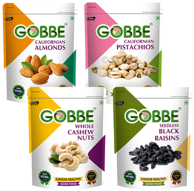 Combo Pack of Gobbe Californian Almonds, Californian Pistachios, Whole Cashew Nuts, Seedless Black Raisins (200gm Each)