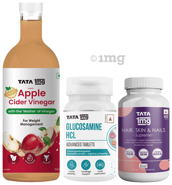 Combo Pack of Tata 1mg Glucosamine HCL 1500 mg Advanced Tablet (60),Hair, Skin & Nails Supreme Capsule (60) & Organic Apple Cider Vinegar (500ml)