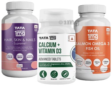 Combo Pack of Tata 1mg Calcium + Vitamin D3 Advanced Tablet (60), Salmon Omega 3 Fish Oil Capsule (60) and Hair, Skin & Nails Supreme Capsule (60)
