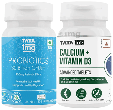 Combo Pack of Tata 1mg Calcium + Vitamin D3 Advanced Tablets & Probiotics 30 Billion CFUs+ Capsule (60 Each)